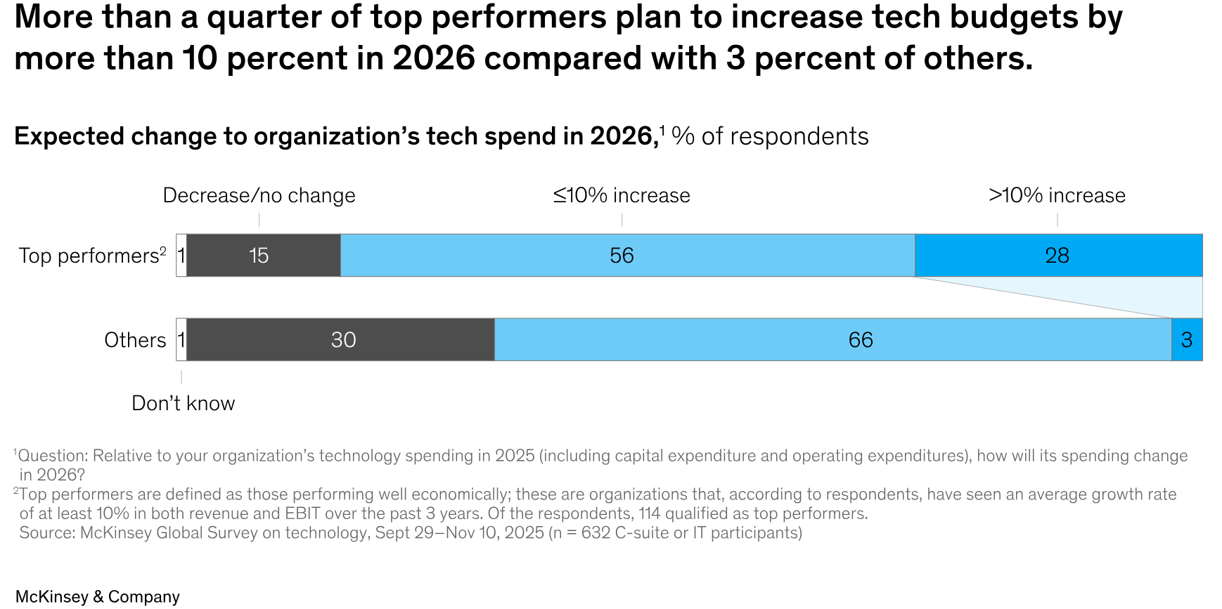 Otro de los hallazgos más contundentes del informe de McKinsey está vinculado al nivel de inversión tecnológica. Las empresas líderes están invirtiendo más y lo hacen de forma mucho más agresiva.